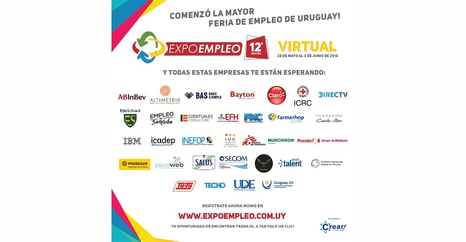 Hasta el próximo domingo 3 de Junio, y en un contexto complejo para el mercado laboral, CREAR Comunicación nuevamente logró reunir a reconocidas empresas que proponen oportunidades laborales reales y concretas: ABINBEV, ALTIMETRIK, BAS BASIC & SIMPLE, BAYTON GRUPO EMPRESARIO, CLARO, COMITÉ INTERNACIONAL DE LA CRUZ ROJA, DIRECTV, EDU SCHOOL, EVENTUALES CONSULTORA, EXCELENCIA EN FACTOR HUMANO, FABRICAS NACIONALES DE CERVEZAS, FARMASHOP, FUNDACION CARLOS SLIM, IBM, INSTITUTO DE CAPACITACIÓN Y DESARROLLO PROFESIONAL (ICADEP), INSTITUTO NACIONAL DE EMPLEO Y FORMACIÓN PROFESIONAL (INEFOP), INSTITUTO URUGUAYO DE COACHING, MEDICOS SIN FRONTERAS, MURCHISON, PRONTO!, PROSEGUR, PSICOWEB, SALUS, SECOM, SEGURIDAD S.A., SMART TALENT, SOCIEDAD URUGUAYA DE GESTION DE PERSONAS, SUPERMERCADOS TA-TA, TECHO UNIVERSIDAD DE LA EMPRESA (UDE) Y URUGUAY XXI.-